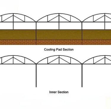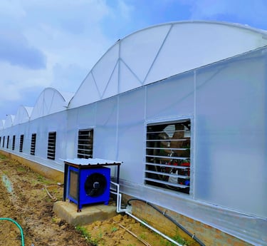 > A Fan-Pad Polyhouse is an advanced climate-controlled greenhouse system designed for precision farming and high-value crop production. It uses a combination of exhaust fans and cooling pads to maintain optimal temperature and humidity inside the structure.